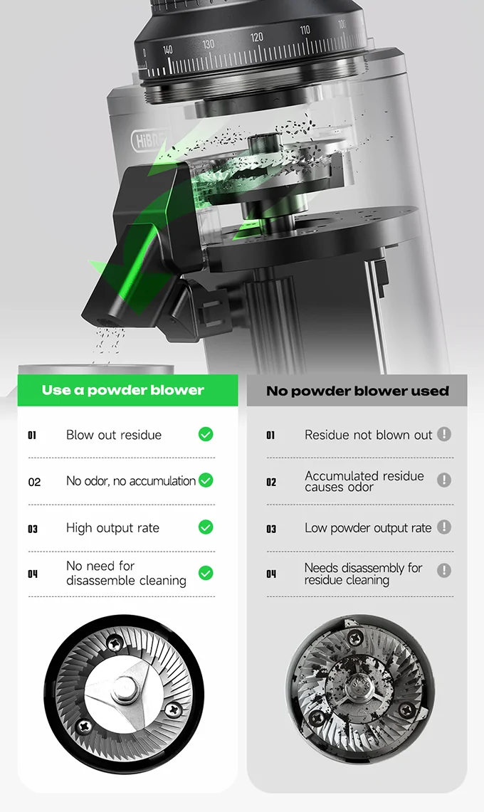 - Dual-layer anti-static technology (inner & outer): Static buildup is a serious annoyance with grinders (beans fly, grounds cling). HiBREW’s system uses “active ionization + passive shielding” to reduce waste, mess and leftover clinging grounds. (HiBREW)