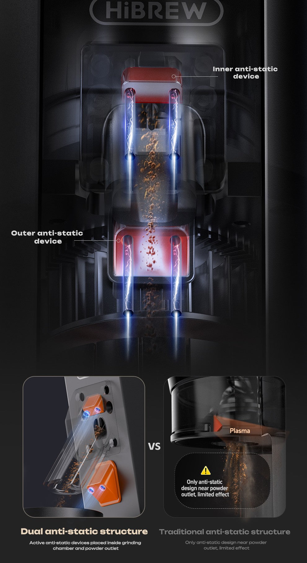 Our dual-plasma system neutralizes static electricity at both the grinding chamber and the outlet. This "active ionization + passive shielding" approach ensures a mess-free, waste-free, and highly efficient grinding experience.
