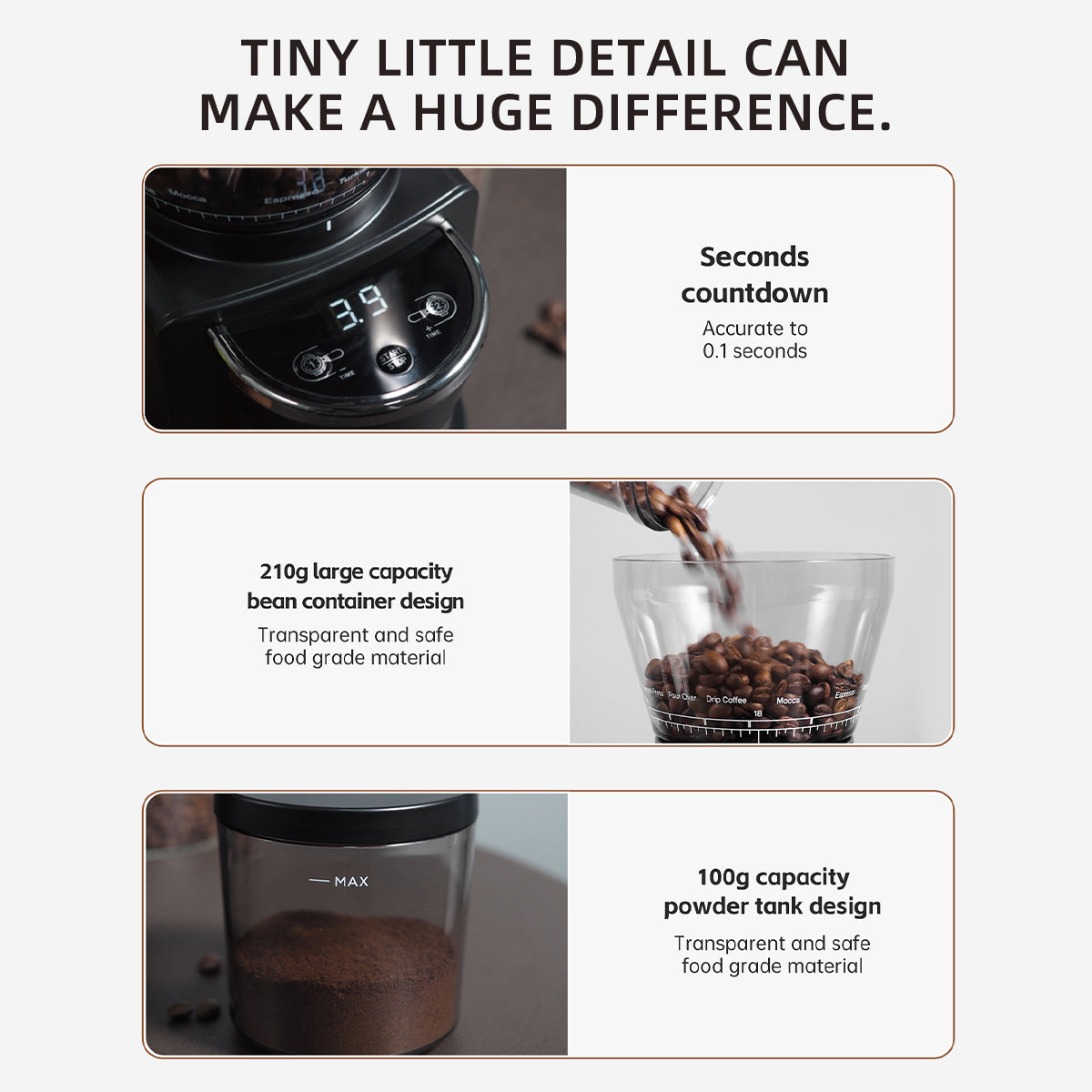 99.5% grinding efficiency! G3’s stainless steel burr converts 18.1g beans to 18g powder—maximizing yield and preserving aroma.