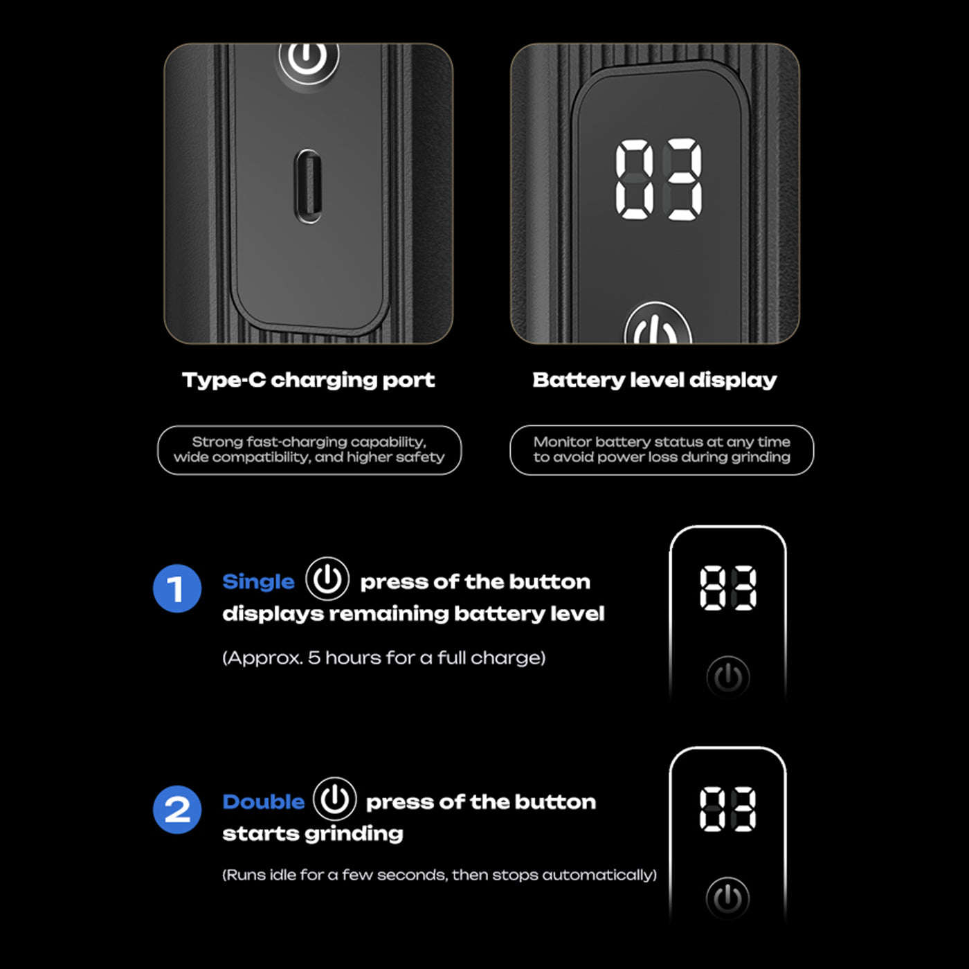 Espresso (0–60): Fine grind – ~50 cycles per charge