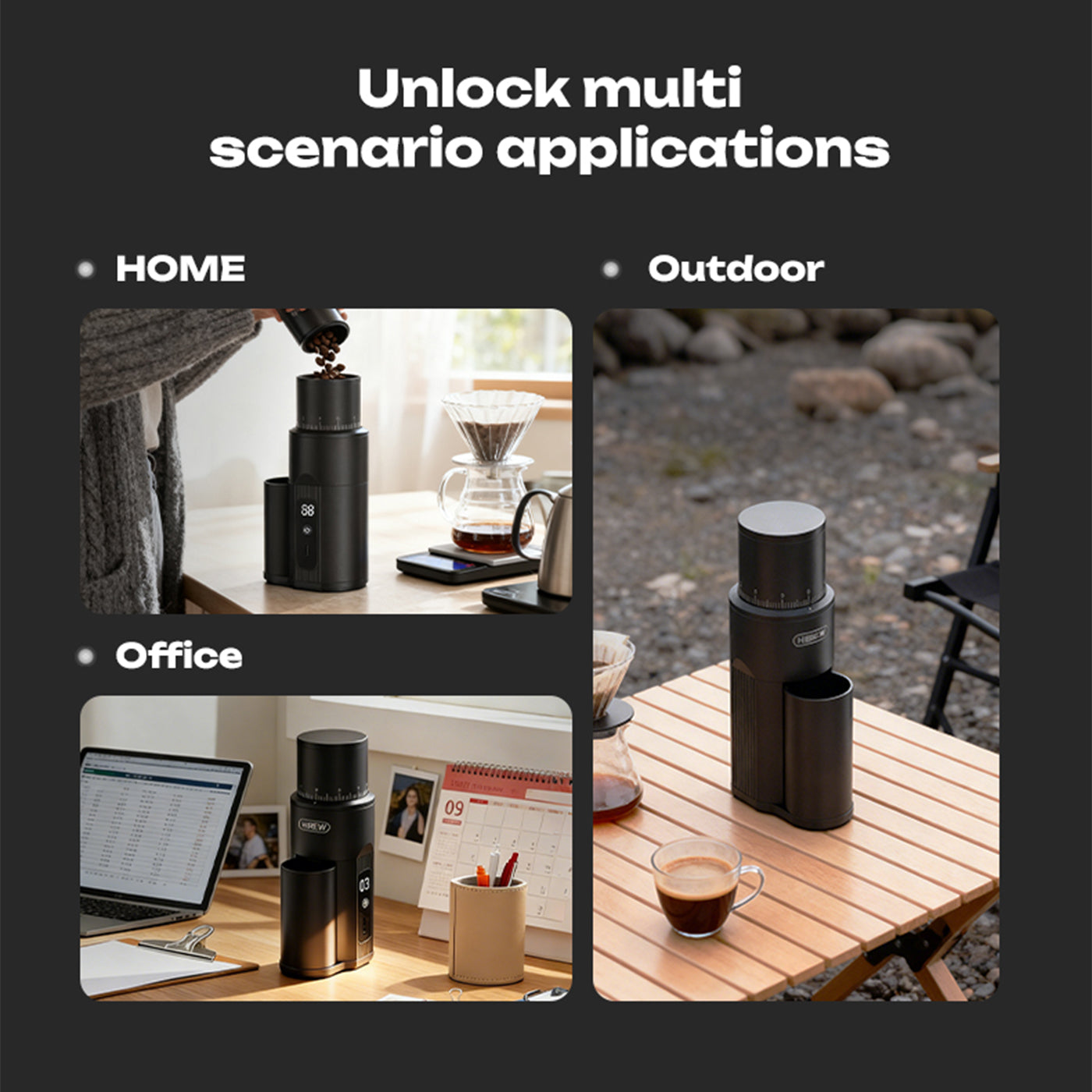 HiBREW G5mini Portable Electric Coffee Grinder features a 38mm 420 stainless steel conical burr with 100-step stepless grind adjustment, perfect for espresso to French press. Powered by a dual-battery system with 5200mAh capacity and Type-C fast charging, it offers quiet operation and durable aluminum alloy build. Ideal for home, office, or travel. Shop now for fresh coffee anytime, anywhere!